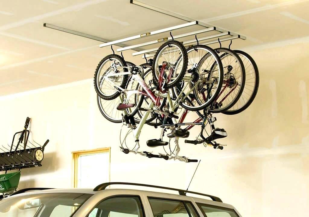 Особняком стоят подвесные системы, позволяющие хранить велосипеды всех членов семьи под потолком гаража или остеклённой лоджии. Стоимость такой потолочной системы хранения для четырёх велосипедов с удобным механизмом опускания превышает 10 тысяч рублей