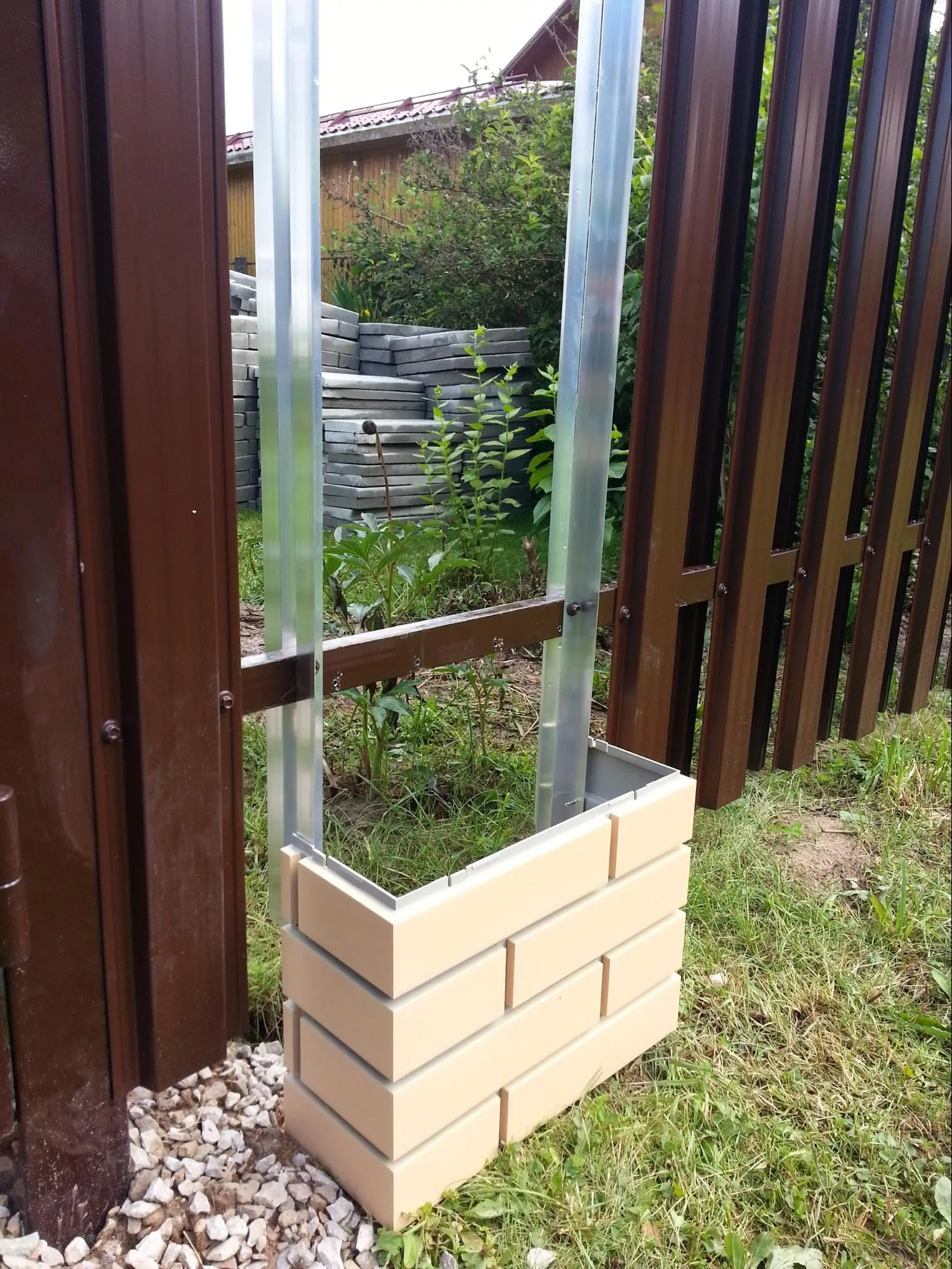 Элементы конструкции можно устанавливать с одной стороны или с обеих сторон имеющегося забора. Создание имитации кирпичных столбов выполняется в определенной последовательности: