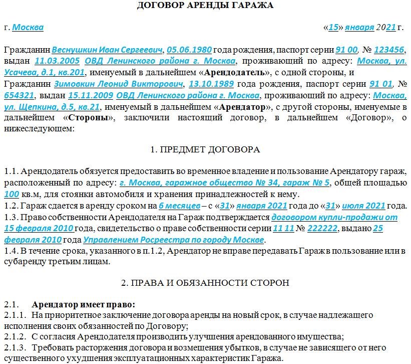 - Наименование — «Договор аренды гаража между физическими / физическим и юридическим лицами»;