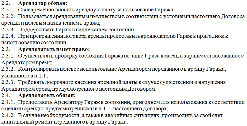 - Здесь разъяснены права и обязанности обоих лиц. Основные положения договора касаются поддержания гаража в надлежащем состоянии и своевременной оплаты всех задолженностей.