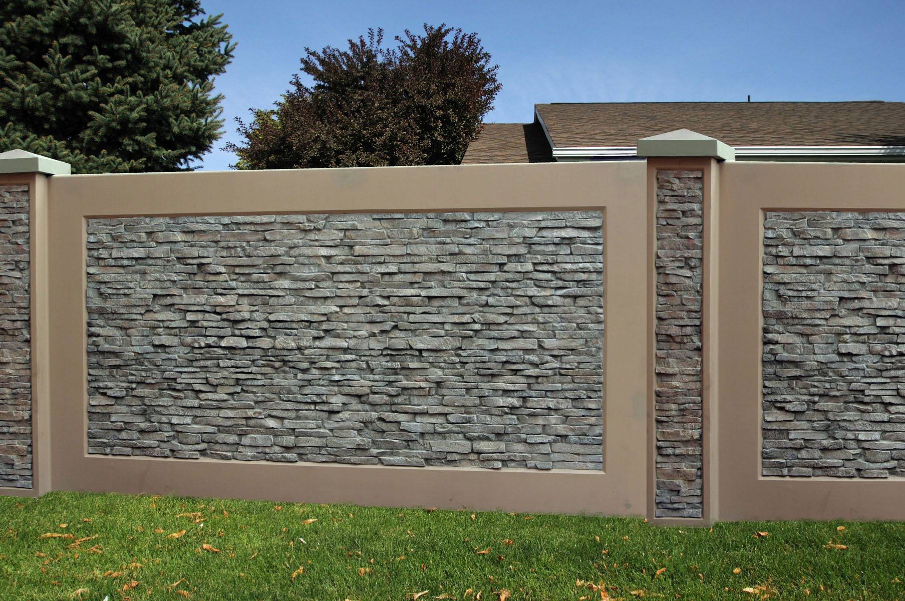- Наборные ограждения. Для создания наборного забора из бетона применяются отдельные плиты, украшенные разными декоративными элементами. Между этими плитами допускается наличие небольших промежутков, но обычно владельцы частных участков предпочитают глухие конструкции. Ограда часто украшается материалами, имитирующими камень или древесину.