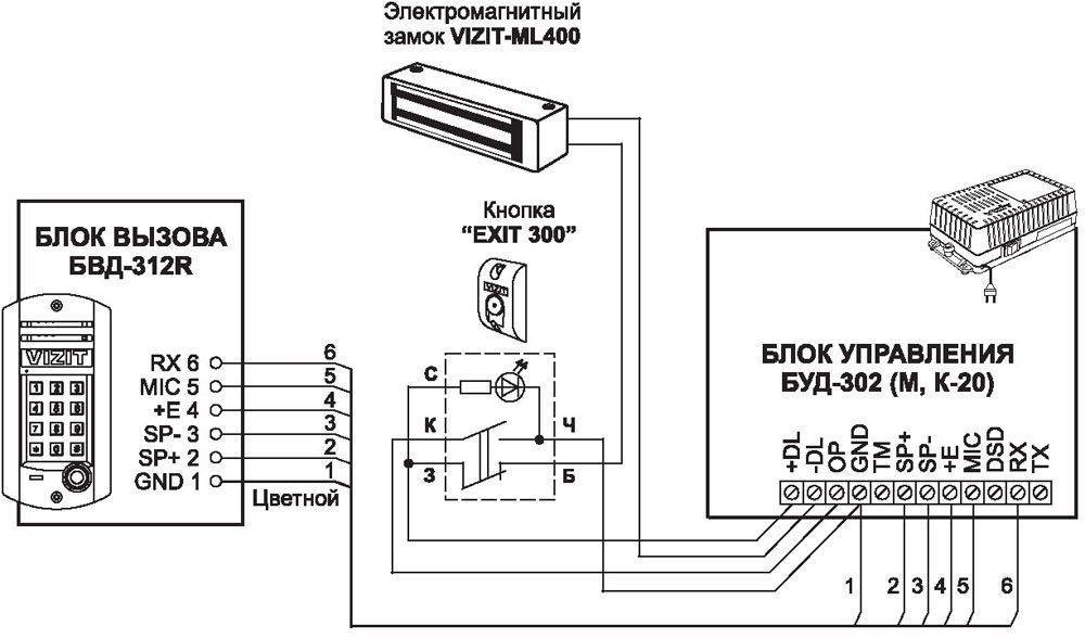 На этом рисунке отображены основные компоненты стандартного оснащения. Блок вызова устанавливают на внешней стороне входной двери . На нем есть клавиши для набора номера квартиры, специальная контактная площадка. К ней прижимают электронный брелок («таблетку») для разблокировки электромагнитного замка. Соответствие кода этого ключа образцу проверяет блок управления. Изнутри отключить подачу питания на замок и открыть дверь можно с помощью специальной кнопки.