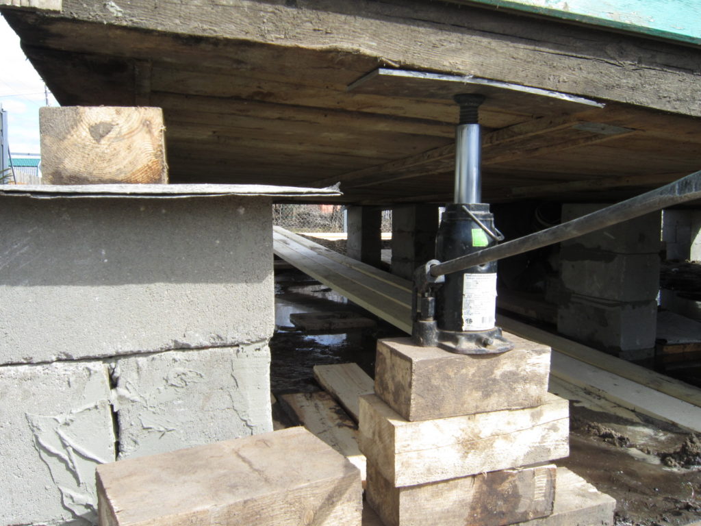 Наиболее простой и доступный широким массам способ поднятия коробки – домкрат. Так, для этой цели подойдет специальный автокран с подходящей длины стрелой или домкрат. Первый вариант подходит для недавно возведенных построек.