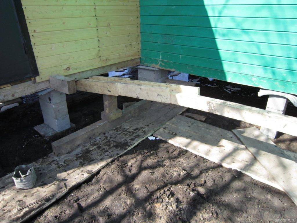 Дом поднят по всем правилам: крепкие подпорки из бруса и правильная установка домкрата на твердой поверхности Источник zaggo.ru
