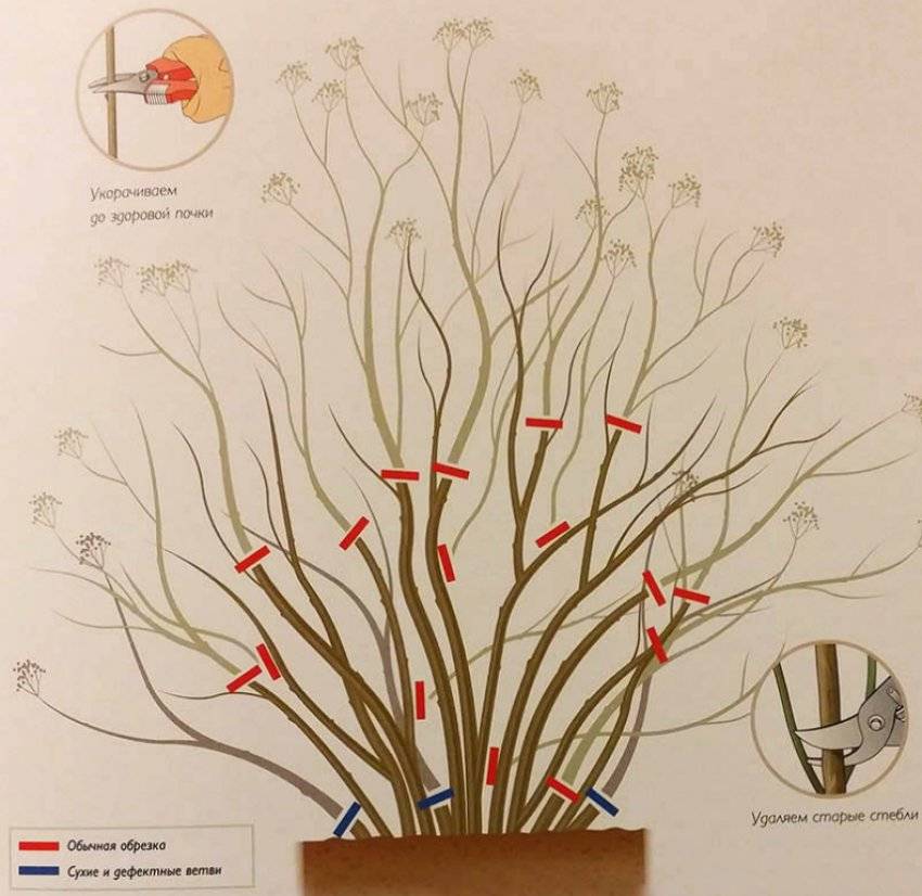 в срезании у растения по окончании цветения сухих соцветий, чтобы избежать формирование семян, иначе кустарник может прекратить свой рост;