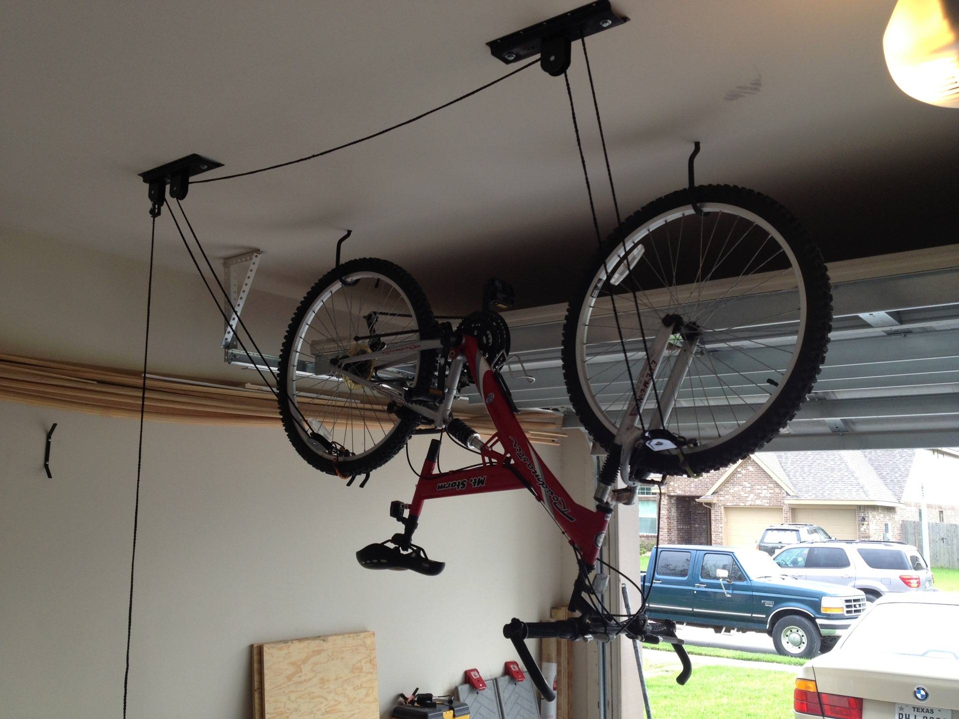 В магазинах спортинвентаря часто продаются специальные крючки, которые помогут вам сэкономить место и прекрасно подойдут для хранения велосипеда в гараже. Бывают и специальные стойки, которые будут держать велосипед в подвешенном виде. Они крепятся к стене, опираясь на пол, это позволяет закрепить не один велик, а несколько сразу.
