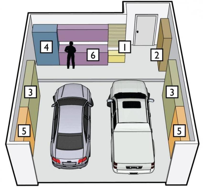 Для того чтобы машину можно было поставить как можно ближе к воротам гаража, необходимо, чтобы дверь в створках ворот располагалась максимально близко к стене и в гараж можно было входить и выходить, не переставляя машины. Еще один небольшой совет: рубильник для отключения электричества в гараже должен располагаться рядом с дверью. Это позволит выключать электричество непосредственно перед закрытием гаража, чтобы не выходить из него в темноте.