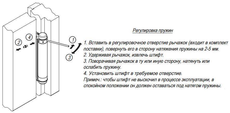 В процессе эксплуатации двери пружина ослабляется, а потому требует регулировки. Специалисты рекомендуют регулярно проверять ее работоспособность и выполнять донастройку.
