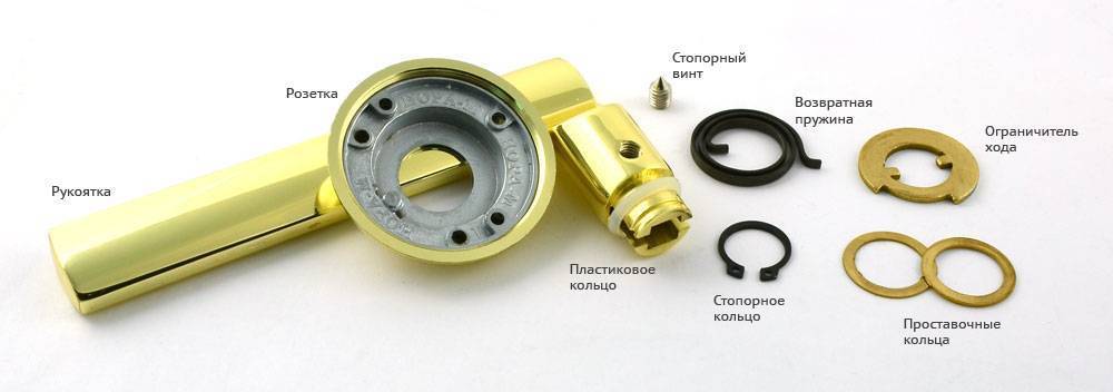 Хотелось бы отдельно перечислить составные элементы поворотных и нажимных устройств, чтобы в дальнейшем было проще понять, как разобрать ручку межкомнатной двери. В состав ручки входят: