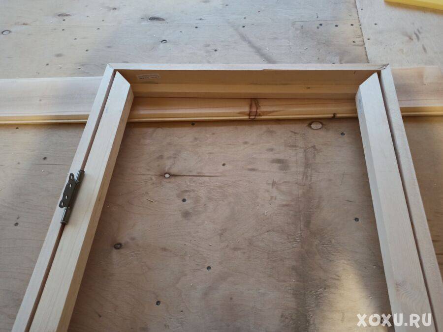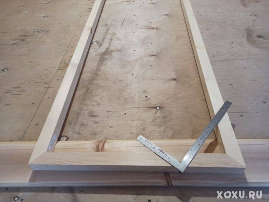 Когда краска высохнет, продолжим изготовление дверной коробки. Положим полотно на ровную поверхность и соберём элементы коробки около него.