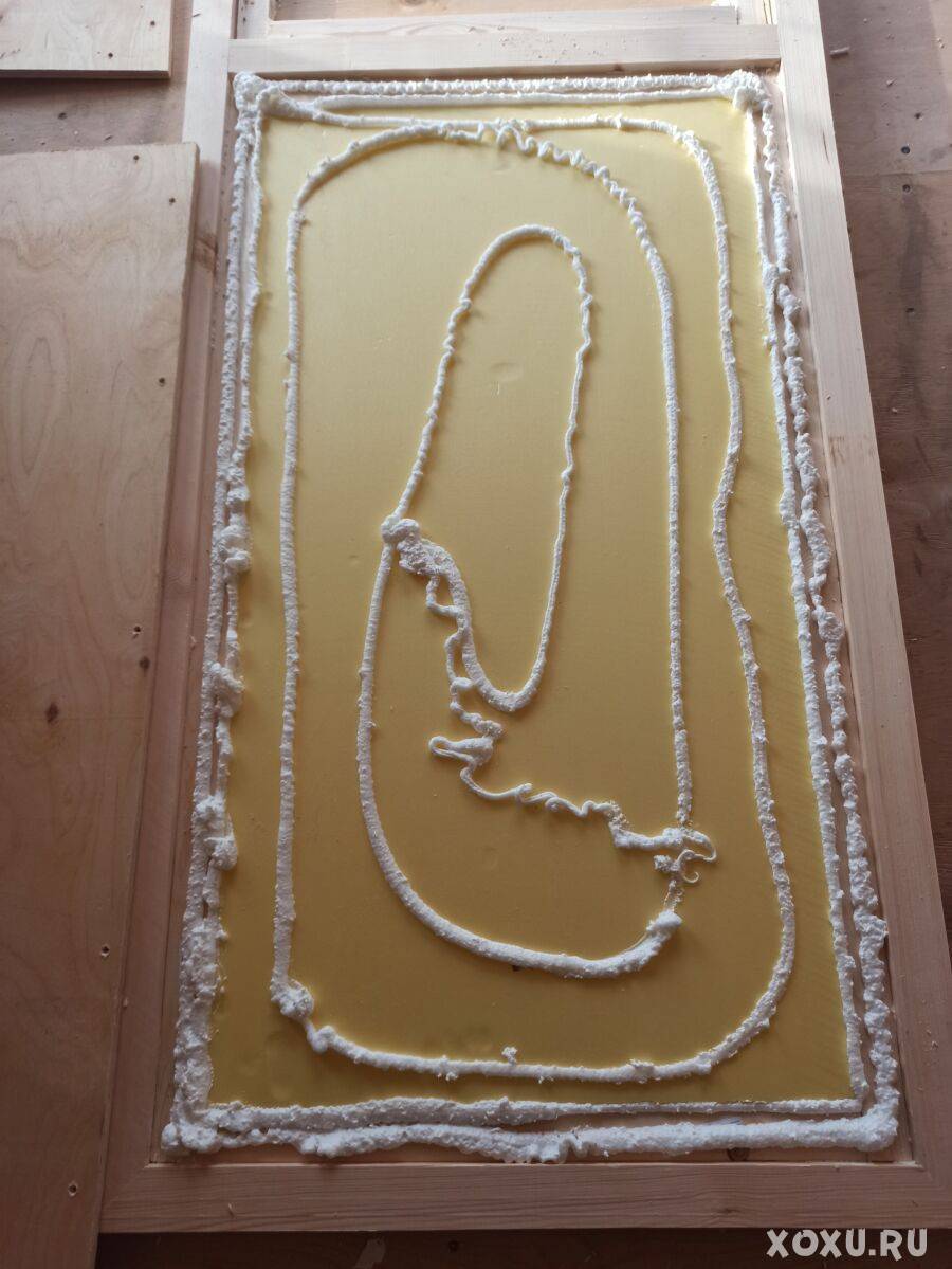 Для облицовки рамы используется фанера либо ДВП. Выполняется разметка, рама снимается. Рама возвращается на прежнее место. Её нужно прижать к облицовочному материалу, обработанному клеем.