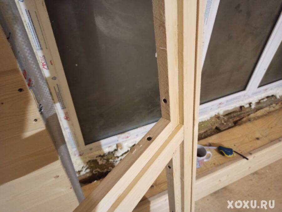 У нас будет стеклопакет, состоящий из двух стёкол. Для этого изготовим деревянные бруски. Толщина доски – 40 мм, планируется отделка вагонкой 1 см, стекло – 0,5 см, штапик – 1 см. Путём несложного вычитания = 4+1–(0,5*2)–(1*2) получим, что ширина брусков будет равна 2 см. Сделаем 4 штуки и прибьём их тонкими гвоздиками, сместив от центра на 5 мм (толщина вагонки пополам) по периметру оконного проёма.