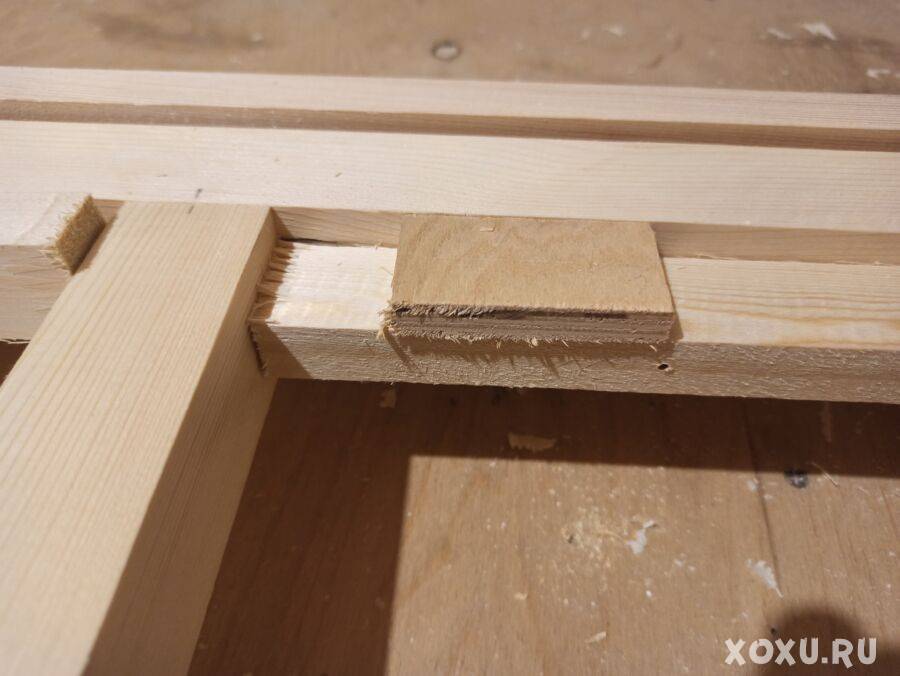 - Нарезать заготовки необходимого размера. Если размеры исходного материала меньше размеров заготовок, нарезать несколько частей для последующего склеивания.Обработать все поверхности заготовок рубанком или наждачной шкуркой.Склеить все заготовки деталей, нарезанных по частям. Клей необходимо наносить сплошным слоем на обе заготовки и выдерживать в сжатом состоянии необходимое время.После затвердевания повторно обработать поверхности деталей и придать им нужные размеры.В соответствии с выбранной конструкцией фрезеровальным станком вырезать пазы и шипы на всех деталях.