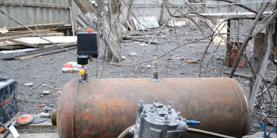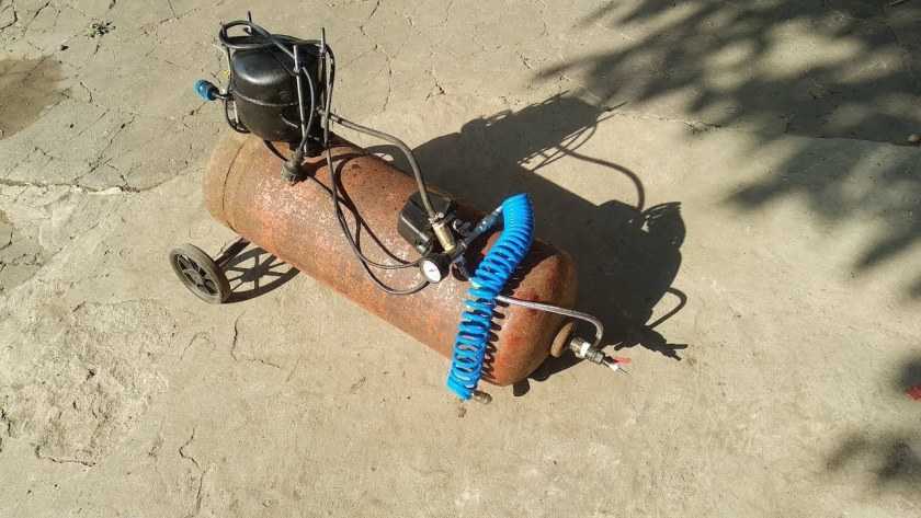 Рассмотрим пример такой сборки. Возьмём за основу компрессор ЗИЛ 130, пропановый баллон на 50 литров. Для сети в 220 вольт нужен двигатель на 2–3 киловатта, при использовании 3-х фаз мощность может быть меньше. Рама изготавливается из стального уголка, для крепления необходимы болты, саморезы, герметик, хомуты.