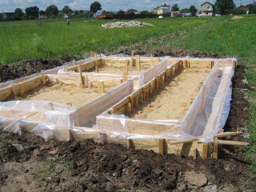 - Внутреннюю поверхность опалубки покрывают полиэтиленовой плёнкой или листами рубероида. Этим преследуют достижение 2 целей: облегчить демонтаж деревянных конструкций и устроить гидроизоляцию фундамента.