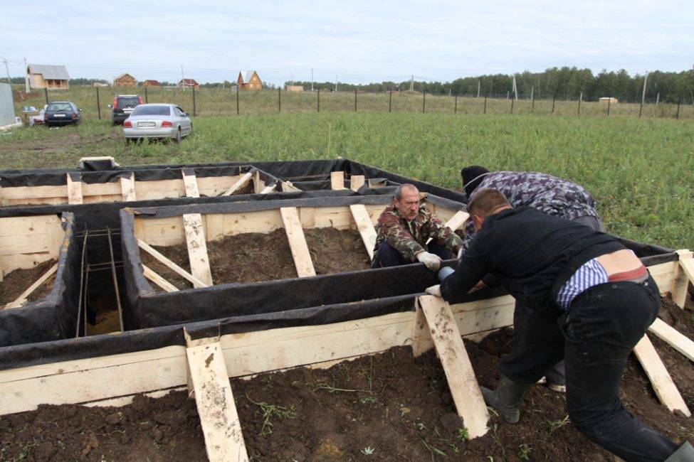 Важно, чтобы верхний слой обвязки был ниже уровня верхней границы бетона на 10 см и на столько же выше уровня земли.