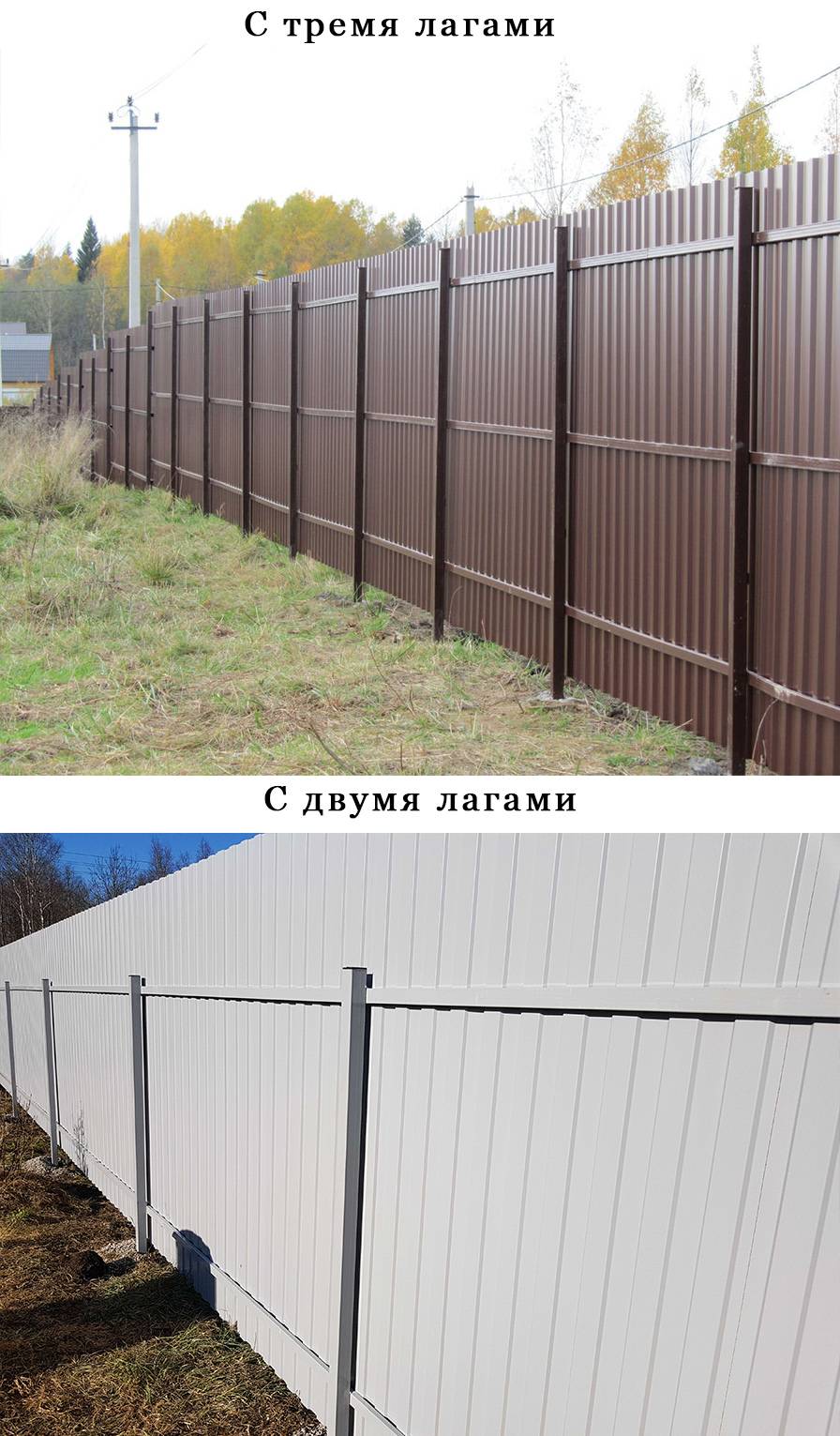 - Для расчета лаг (перекладин между столбами) производят деление периметра на длину лаги и умножают на 2. Обычно для забора на дачном участке профлисты крепятся к двум лагам. Если предполагается крепление к трем лагам, соответственно полученную величину умножают на 3. Количество рядов прогонов зависит от высоты забора: чтобы установить забор высотой до 2 м достаточно двух рядов лагов, при заборе выше 2 м необходимы три ряда.