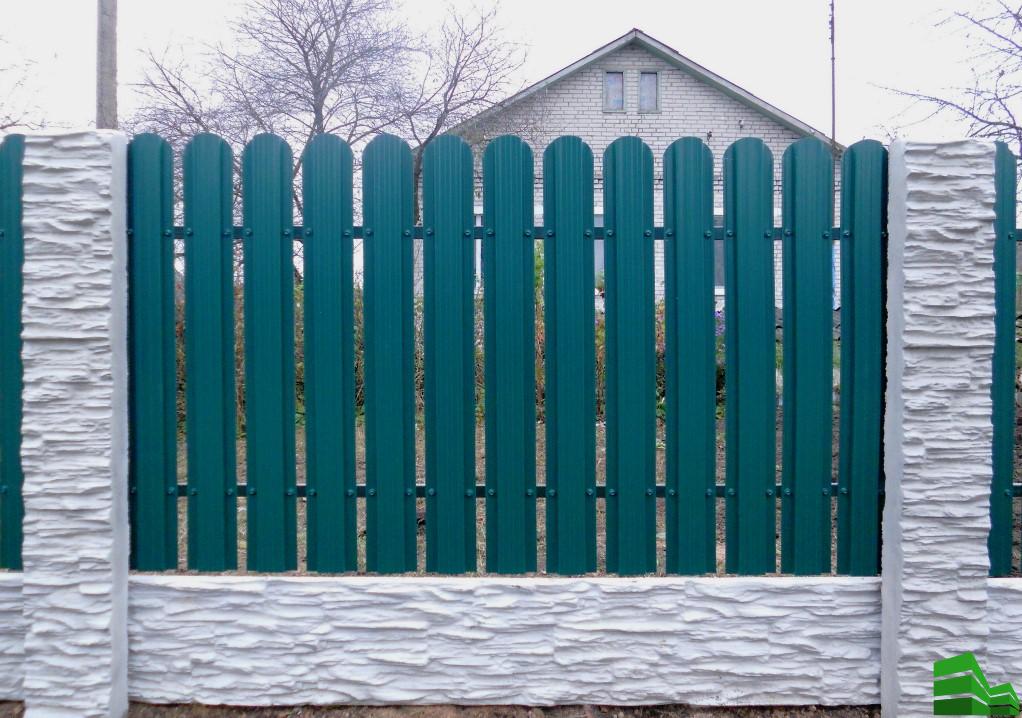 - Для секционного забора. Расстояние между опорами равно общей (если секция – это один лист) или полезной (если секция – 1,5-2 листа) ширине листа профнастила.