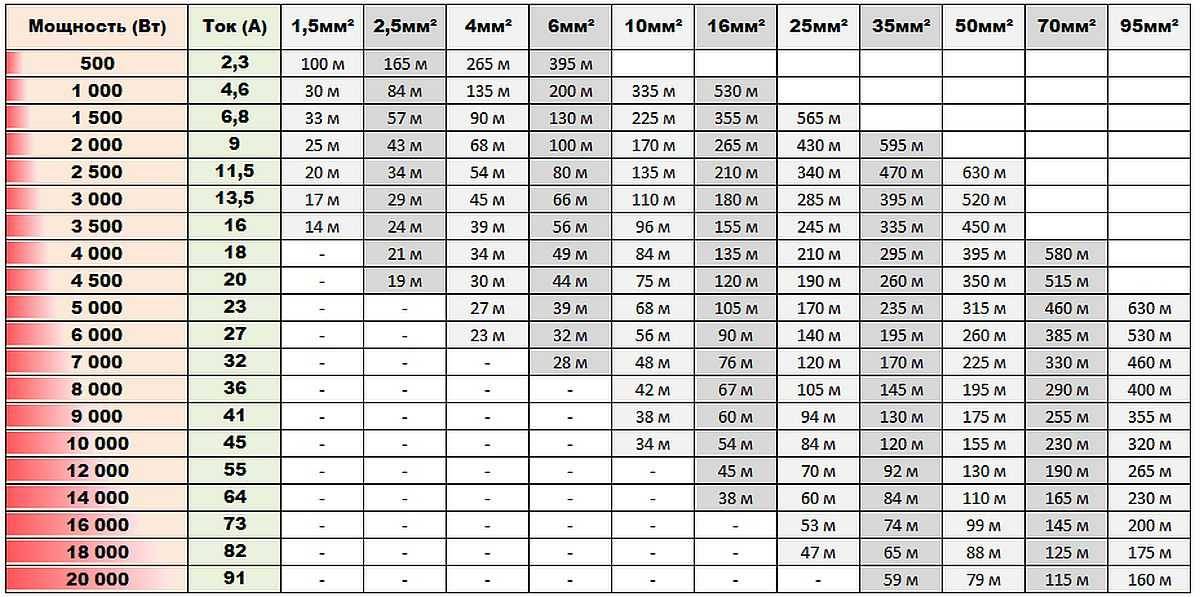 Для определения сечения провода используется та же сумма нагрузки, к которой прибавляется 20 – 30% для запаса прочности. Конкретное значение площади жилы выбирается из таблицы таким образом, чтобы полученная величина подключаемой нагрузки не превышала допустимой для данного провода.