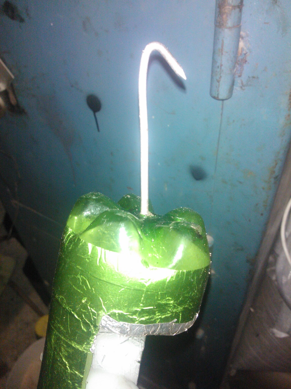 Пробил в донышке бутылки отверстие, засунул гвоздь и согнул его, что бы можно было данную переноску подвесить.