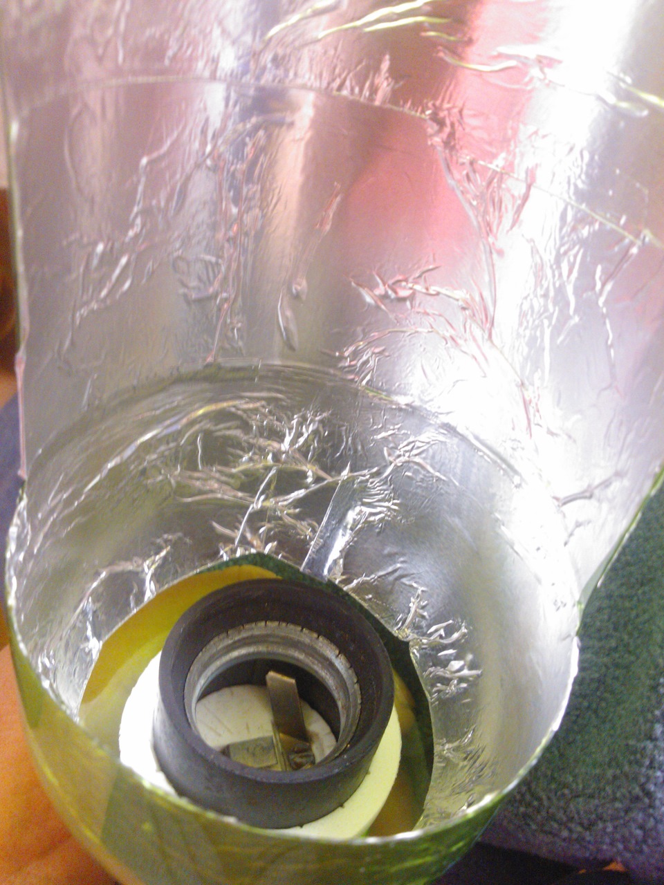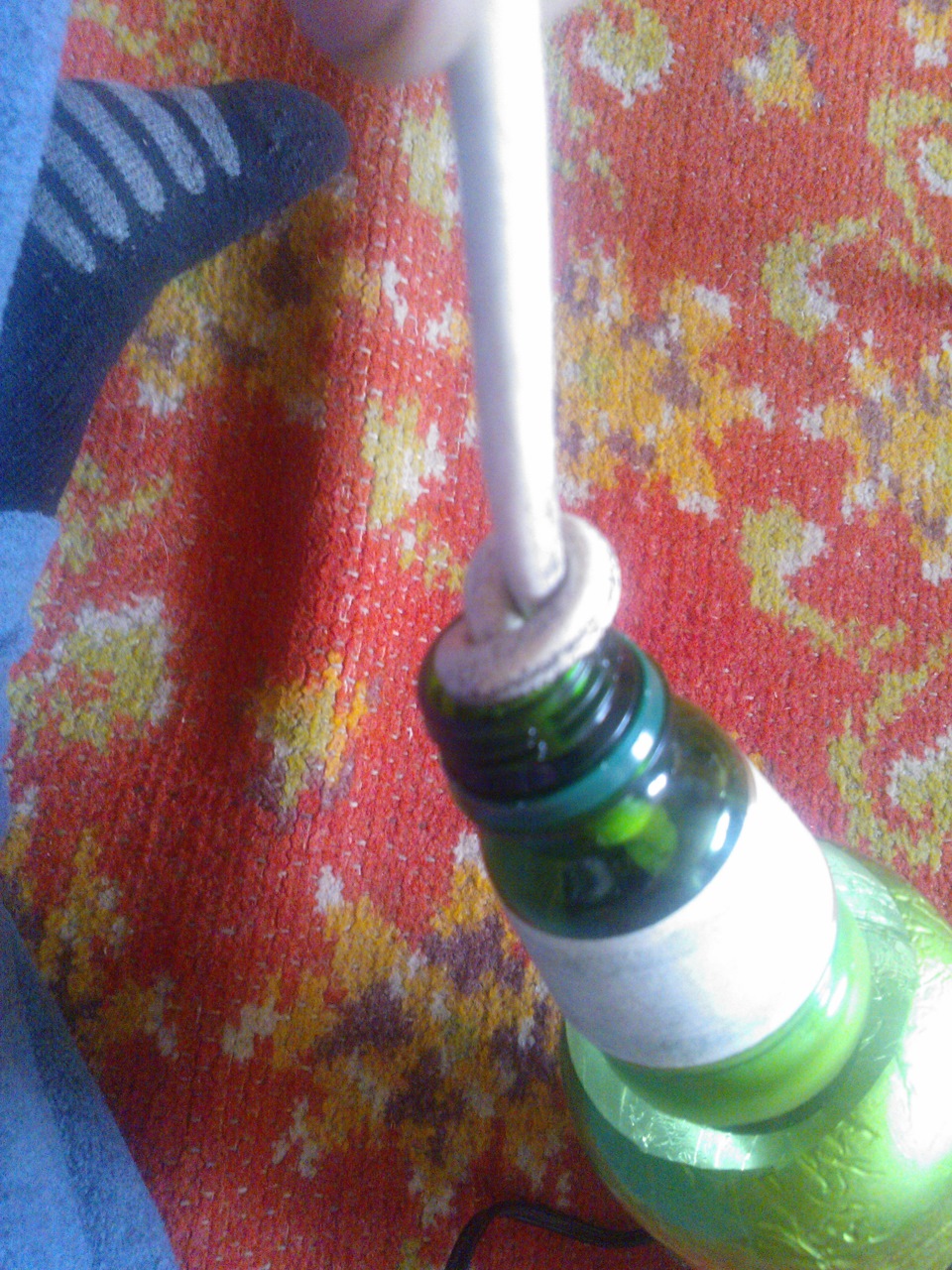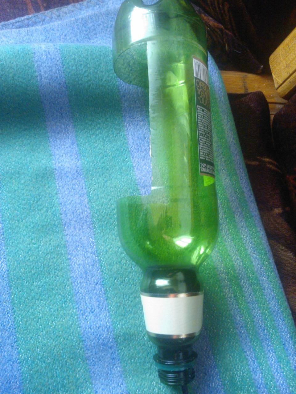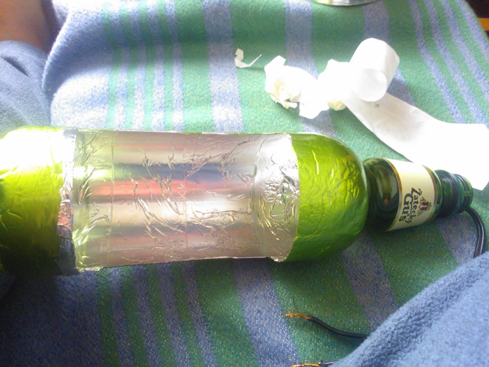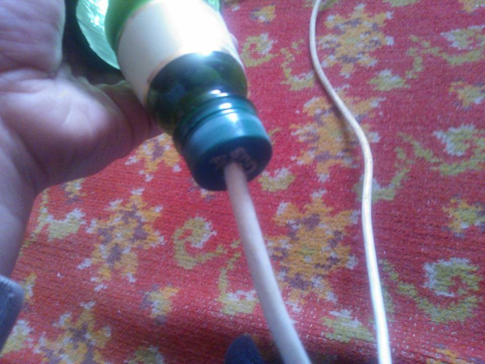 в горлышко вставил патрон, оказалось что горлышко больше и патрон выпадал, тогда я взял утеплитель который клеят на двери и окна, и обклеил патрон, чтобы он плотно вставлялся в горлышко.