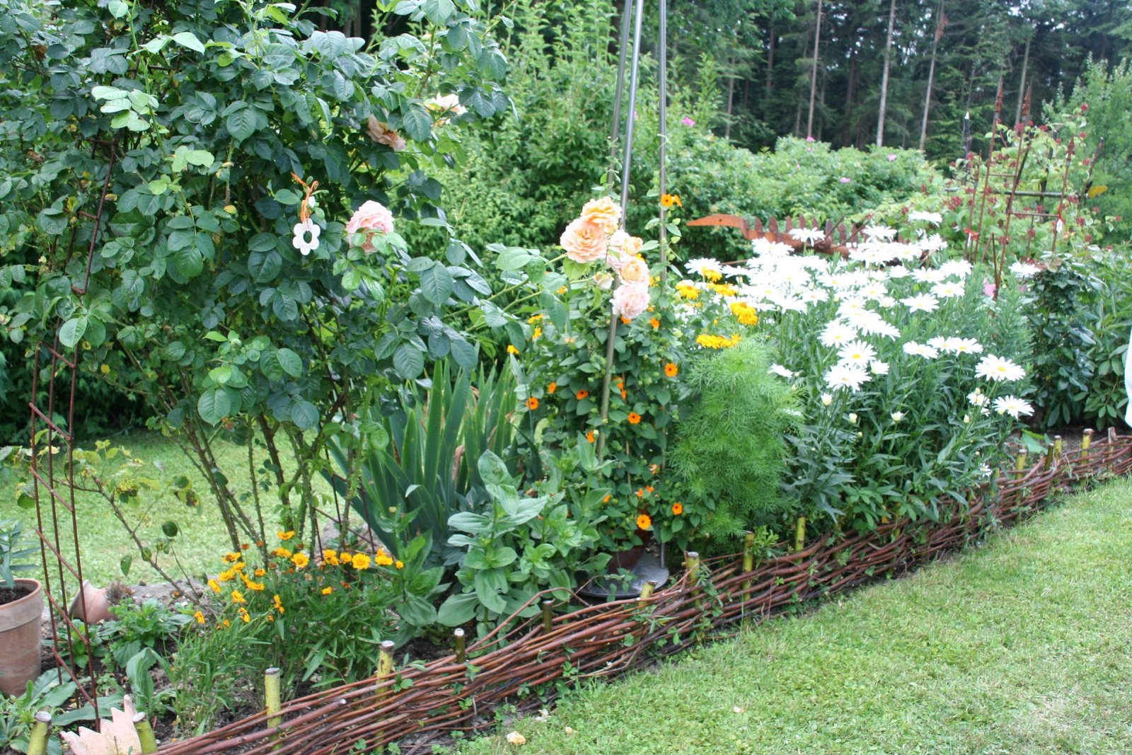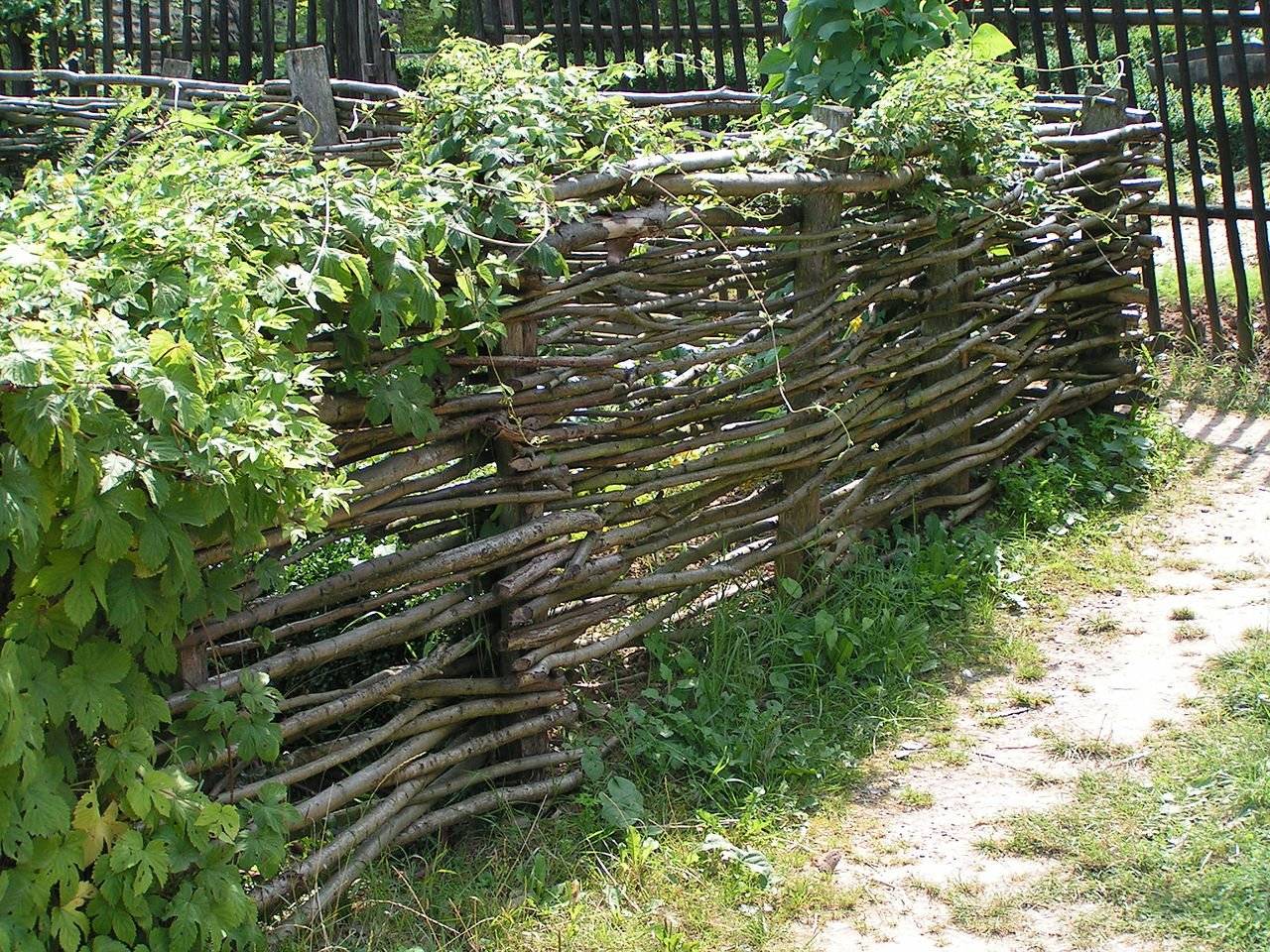 Вертикальный плетень. Колья вбиваются в землю на расстоянии друг от друга. К ним подвязывают прямые прутья горизонтально к земле. Получаются планки, через которые нужно пропускать гибкий прут. Нижним концом (более толстым) он будет упираться в землю, а верхним (более тонким) смотреть в небо. Наверху прутья нужно как-то связать. Способов несколько. Проще всего, перекинуть гибкие концы через самую верхнюю горизонтальную планку или оплести ее. Можно заплести «хвостики» косичкой и т.п. Прутья, соприкасающиеся с землей, часто укореняются. Плетень превращается в живую изгородь. Вариант такого плетня — живой изгороди получается из полыни «Божье дерево». Об этой многолетней полыни и об удивительной простоте укоренения ее ветвей можно прочитать в статье «Полынь лечебная, или «Божье дерево».