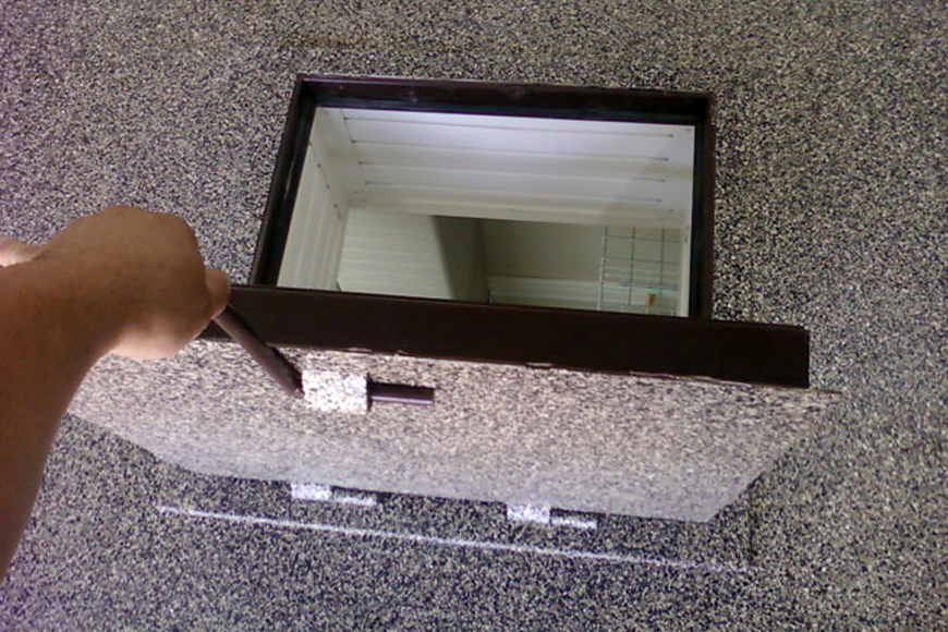 Гаражный подвал перекрывается бетонными плитами, поверх которых заливается монолитный пол (бетонный или полимерный). Для доступа в помещение оборудуется люк — примерно такой, как показан на фото.