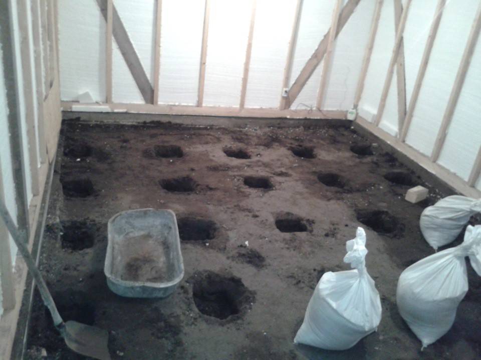 Первым этапом при изготовлении бетонного пола является утрамбовка и выравнивание поверхности. После чего подготовленная поверхность обмазывается жидкой глиной для гидроизоляции.