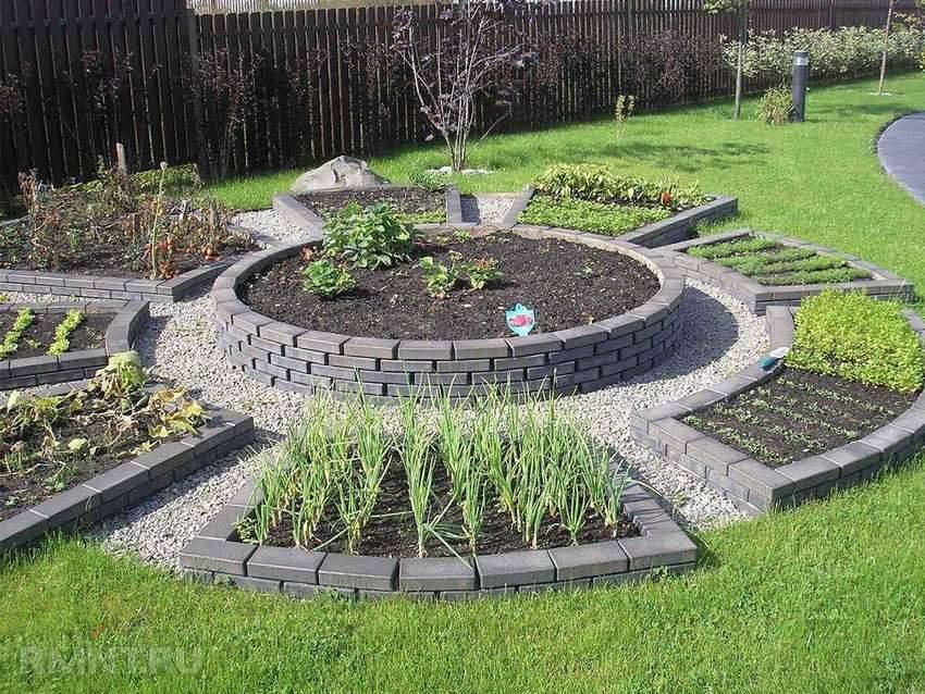 Галька, бетон и камень в дизайне огорода на небольшом приусадебном участке