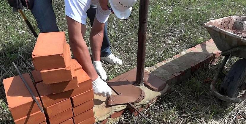 Первый шаг. Формируем столбики. Для этого выложите периметр будущего столба из 4-х кирпичей, оставив между ними свободное пространство. В дальнейшем пустое пространство заполните арматурой и залейте бетоном. Сначала располагаем столбы на высоте 3 кирпича.