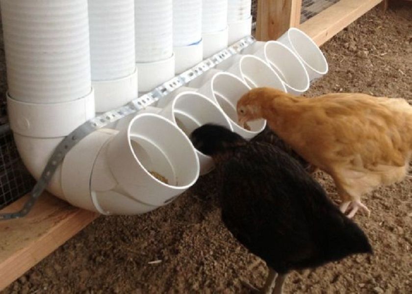 Из канализационных труб легко сделать удобную кормушку для кур. С ней очень удобно подсыпать зерно, не заходя в загон. Куры не могут разгребать в таких кормушках зерно, что экономит корм.
