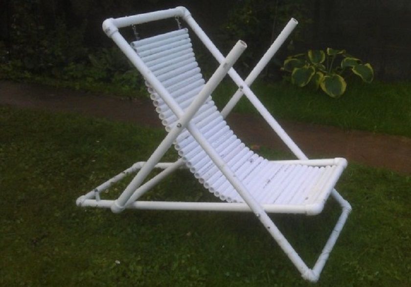Отдых у бассейна или в тени сада невозможно представить без шезлонга. На фото представлен шезлонг, полностью состоящий из пластиковых труб, но можно комбинировать и с плотной материей.