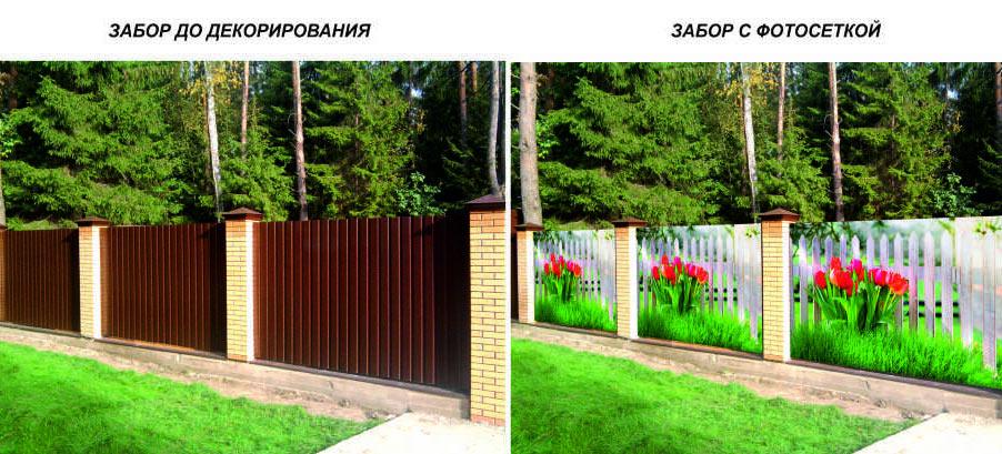 Как только сетка с фотопечатью появилась в продаже, изобретательные садоводы начали использовать её для декора ограды на своих дачах