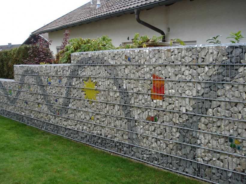 Оригинально и красиво выглядят заборы габионной конструкции. Они представляют собой металлическую сетчатую основу, заполненную камнями