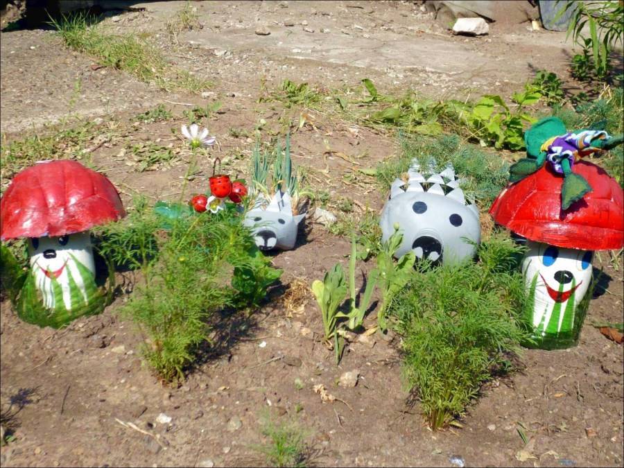 - Для придания оригинальности можно вкопать в землю пластиковые бутылки разного размера, чередуя между собой 1,5-литровые и 2-литровые емкости.