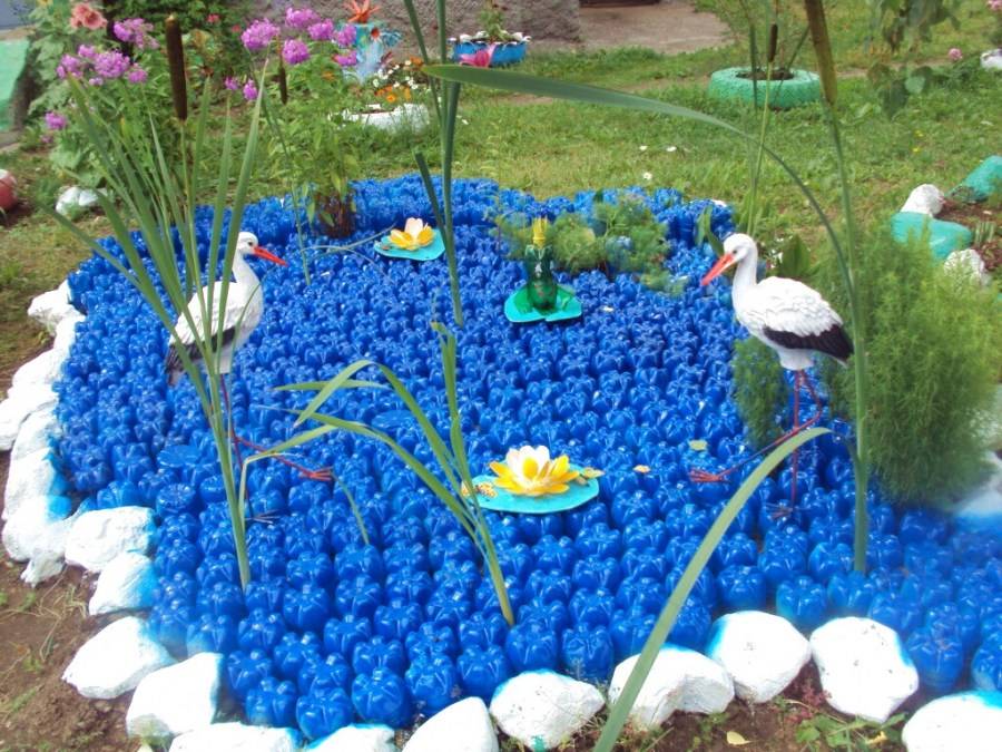 Для того чтобы сделать из бутылок какое-нибудь животное или птицу, необходимо подготовить небольшую насыпь на земле, соответствующую размеру будущего творения. Отлично смотрятся фигуры диаметром 1-2 метра. Насыпанный холм поливается водой и обкладывается по периметру кафелем, плиткой или крупными камнями. Затем расставляются фигуры.
