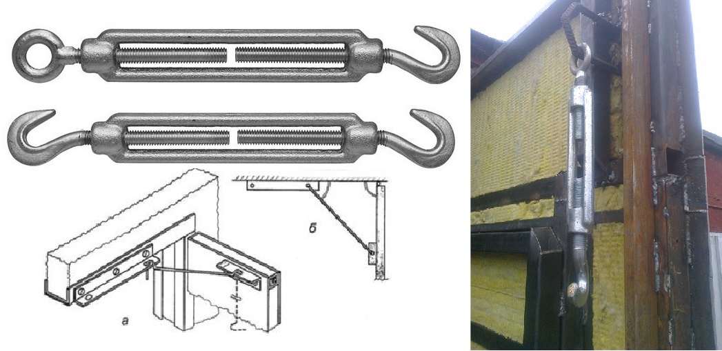 Для ворот гаражей они не подходят, потому что по соседству находятся чужие боксы. Еще одной проблемой является сезонное расширение/сужение самого материала ворот, в таком случае крючок в определенное время года может просто не дотянуться до петли. Чтобы решить эту проблему, можно вместо обычных крючков использовать крючки-стяжки с резьбой, которые подстраиваются под нужную величину.