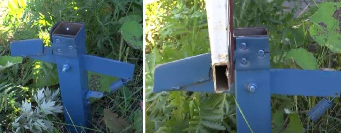 Понадобятся штырь с пружиной и скоба с отверстиями, которую крепят к створке ворот. Тонкости монтажа можно посмотреть на видео от профессионалов.