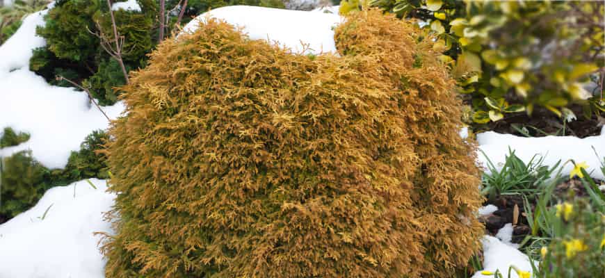 Если туи стремительно желтеют после зимы, нужно притенить деревья с южной стороны. При создании тени дерево со временем нарастит новую хвою и вернет декоративные качества.