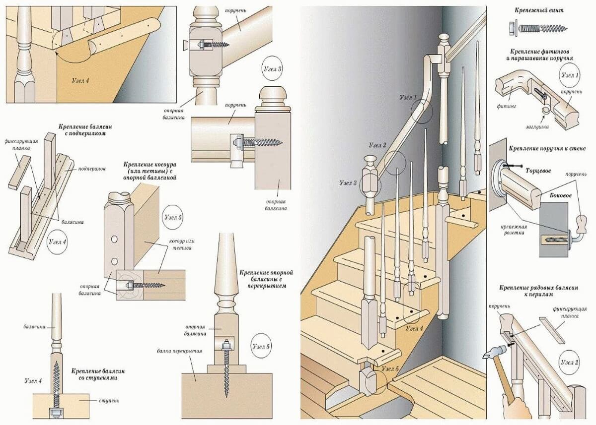 Процесс монтажа производится с помощью вкручивания саморезов в боковые плоскости балясины под углом 30 градусов до основания. Для маскировки этих крепежей высверливаются отверстия, которые потом закрываются шпаклевальным материалом для дерева.