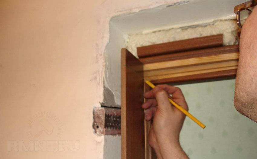 После этого потребуется произвести продольное отсечение доборов таким образом, чтобы их торцевые грани находились заподлицо со стеной. Для чего, вначале все доборы фиксируются в монтажном положении. А после, с изнаночной стороны к каждому из них прикладывается ровная тонкая рейка (можно использовать правило), которая соприкасается со стеной. И в месте соприкосновения рейки с добором наносится разметка.
