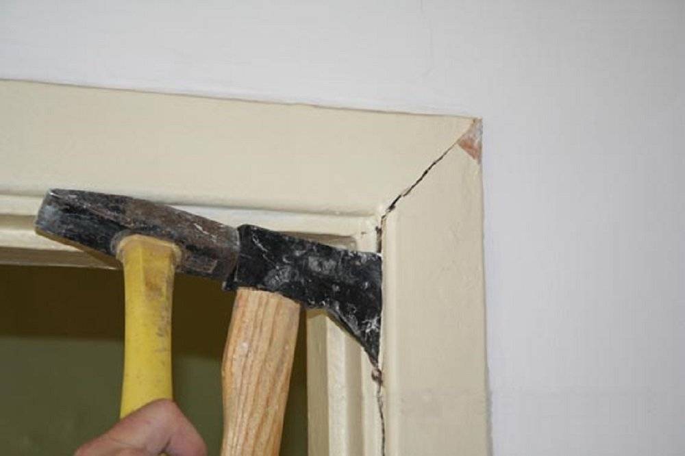 Полезные советы по сборке и установке начинаются с уборки старых наличников и очистке зазоров между дверью и проемом, снятию дверного полотна. Для этого необходимо выпилить две поперечных дырки насквозь сверху вниз. Затем вынимают вертикальные части старой дверной коробки. Можно использовать лом, если не хватает собственной силы. Чтобы верхний брус не мешал монтажу изделия, его снимают таким же образом.
