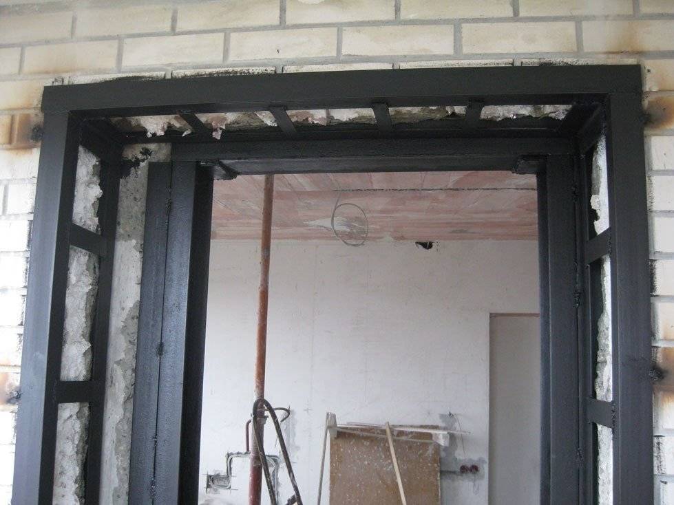 Первым делом его освобождают от всего лишнего: дверной коробки, наличников, доборов. Проход очищают так, чтобы оценить состояние стены. Иногда простенки приходится расширять из-за обветшания, после чего понадобится укрепление под новый «каркас». Следующим делом перекладывают все коммуникации и провода, которым навредит новый рисунок проема. Все слишком близкие к проходу линии тоже переставляют в другое место. Пустой проем обязательно испытывают на прочность стен и в случае потребности в уменьшении определяют способ такого изменения. На этом же этапе подбирают материал для работ. Проем перед началом манипуляций по расширению или сужению должен быть чистым, а его бетон или кирпичная кладка — четко просматриваемыми. Перед сужением проход размечают с помощью металлического правила, поставленного на пол в упор с покрытием стен.