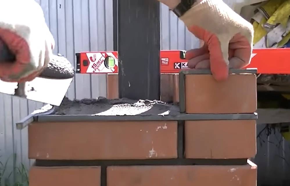 Далее – опору обкладывают кирпичом, устанавливая равномерно металлические закладки – они нужны для крепления створок.