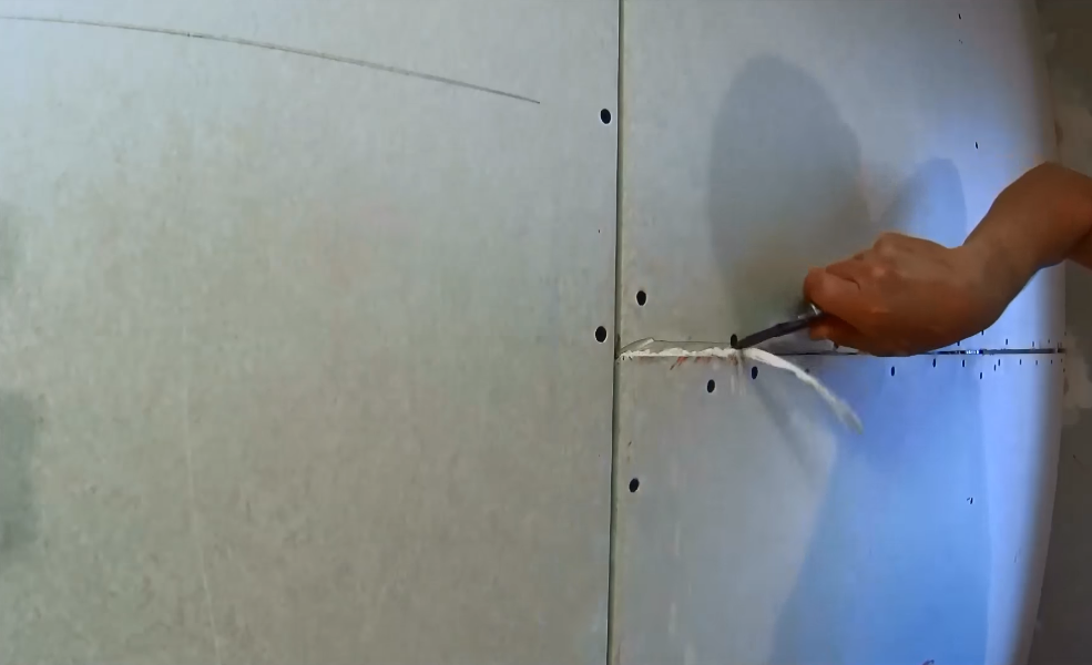 Выполняется подготовка всех горизонтальных стен и торцов гипсокартона, примыкающих к стене. Для это нож располагают под углом 45 градусов и снимают фаску с обеих листов, прилегающих к стыку;