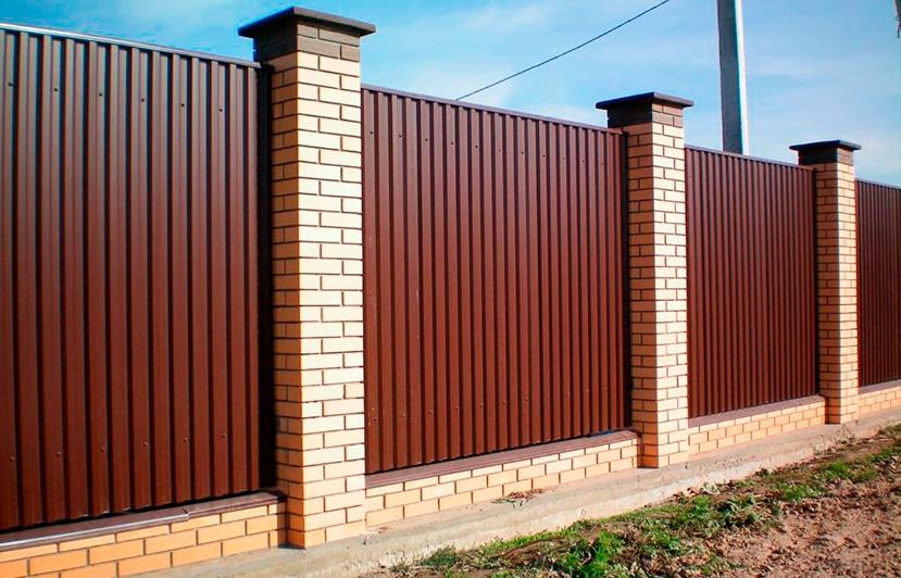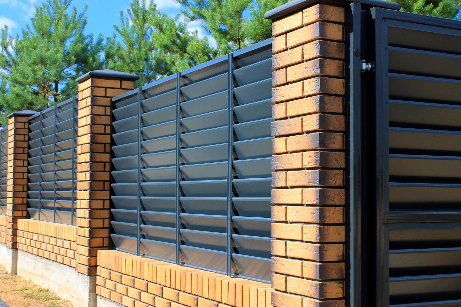 Кирпичные столбы прекрасно сочетаются с заборами разного типа и материала