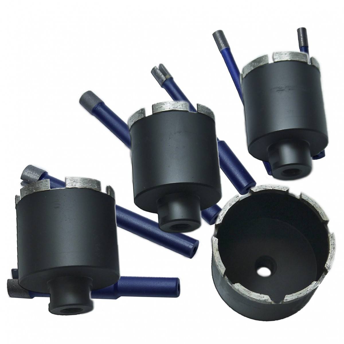 Корончатые инструменты имеют вид металлического стакана. На его торцевой рабочей части находятся режущие зубья, с помощью которых можно выполнять отверстия с большим диаметром. Такие зубья могут иметь алмазное напыление или же быть сделанными на основе твердых сплавов.