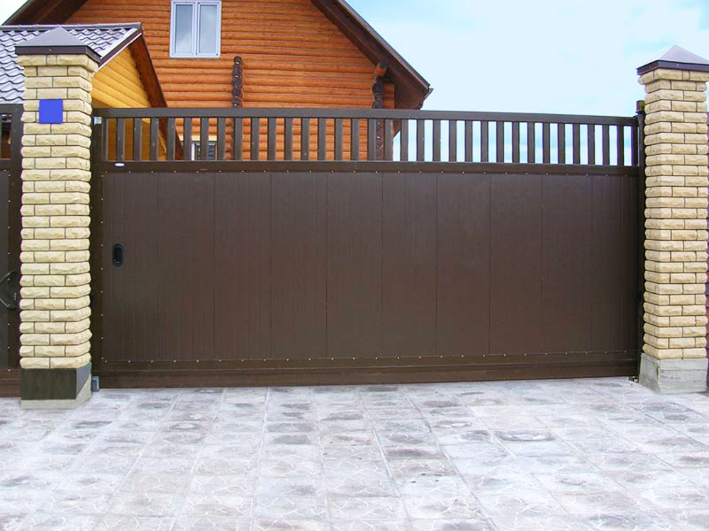 Если на вашем участке мало места для широкого распахивания створок ворот, можно сделать своими руками откатные ворота из профнастила. Вы можете откатывать такую конструкцию вручную или снабдить ее автоматикой.