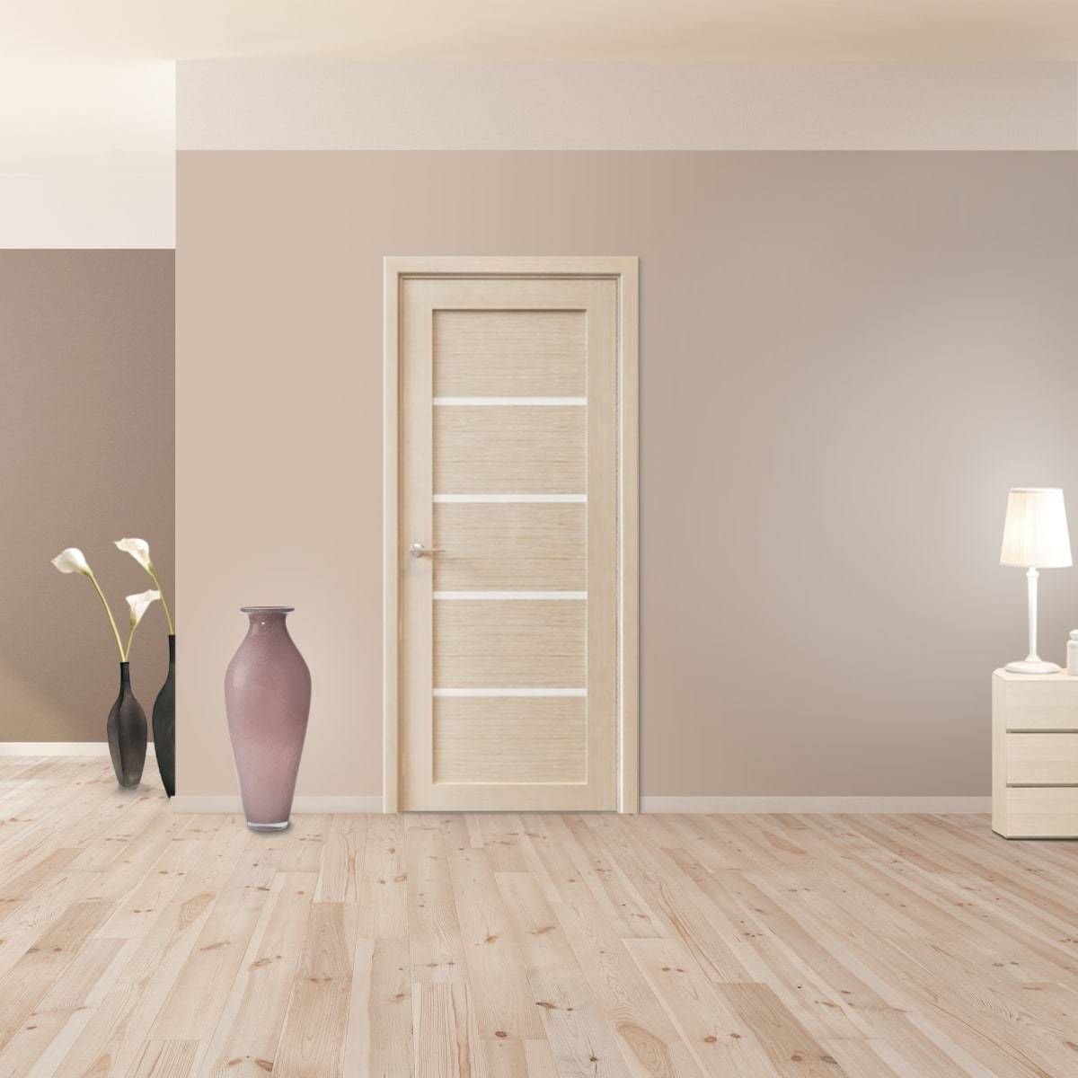 Если во всей квартире напольное покрытие имеет похожий цвет, то можно установить двери на 2-3 тона светлее. Допустимо использовать и более темный оттенок, если пол светлый. Сочетание дверного полотна с полом можно считать традиционным приемом — именно его используют чаще всего.
