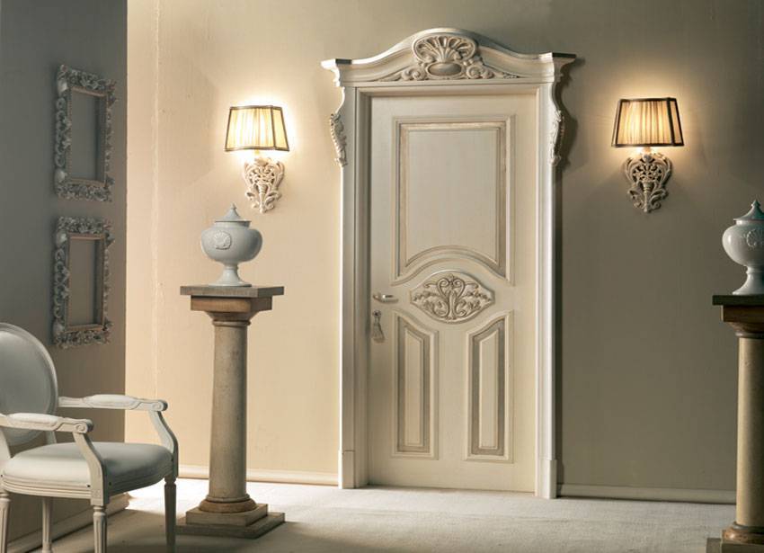 Двухфиленчатые окрашенные двери с декоративной отделкой проема капителями